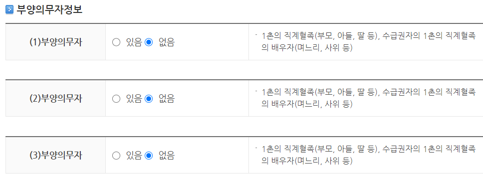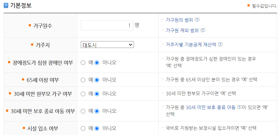 우선 기본 정보를 입력합니다. 가구원수 거주지 등 해당되는 사항을 모시고 체크하시면 됩니다.