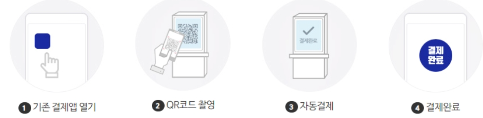 기존 은행, 결제사 어플을 열고 QR코드 촬영을 누르고 가맹점에 있는 QR코드를 찍으면 자동으로 결제할 금액을 은행이체로 결제합니다.
