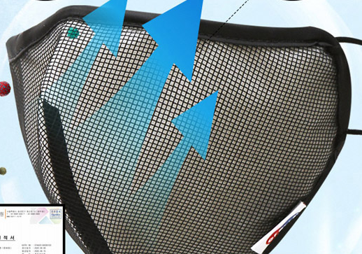 티브이 광고가 전시회에서 나오고 있었는데 망사처럼 구멍이 있는 마스크인데 효과가 KF급이라는 설명이었습니다. 그것이 사실이면 전 무조건 이것만 쓰겠다 생각했지만 역시 불안하더군요. 정말 망사처럼 구멍이 있어요.