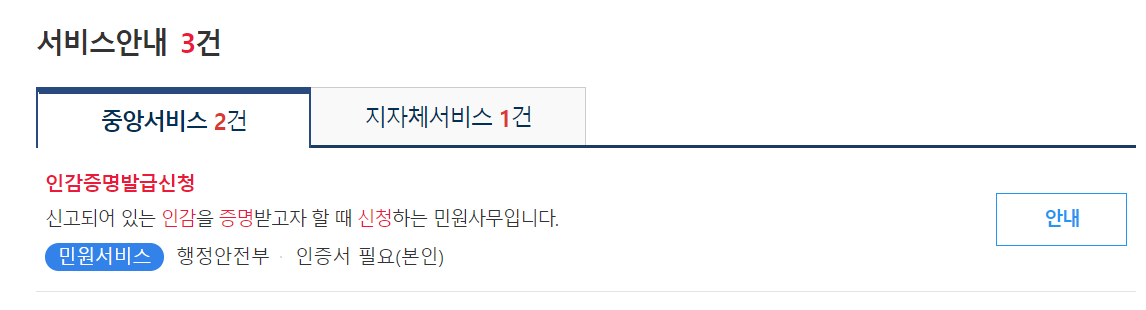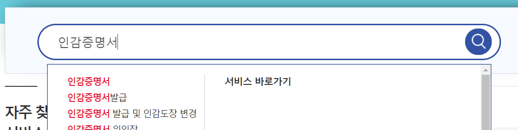 검색어 입력란에 인감증명서를 입력하고 조회를 합니다. 그러면 서비스 안내에 인감증명발급신청이라는 안내란이 나옵니다.