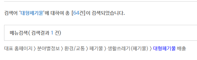검색창에서 대형폐기물이라 검색을 하시면 됩니다. 대형폐기물이라 검색을 하시면 많은 결과가 나옵니다. 보통은 가장 상단에 대형폐기물 배출이라는 항목이 나옵니다.