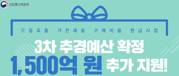 으뜸효율 가전제품 구매비용 환급 사업은 3차 추경예산 1,500억 원을 추가로 지원하여 아직 지원받을 수 있기 때문에 서둘러 신청을 하셔야 합니다. 오늘 포스팅을 보고 해당되시는 분들은 바로 신청을 해야 합니다.