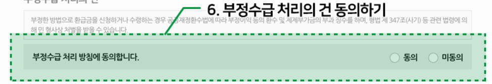 개인정보 수집 이용에 대한 동의를 체크하고 개인정보, 부정수급, 환급 신청에 대한 동의를 모두 체크하고 진행합니다.