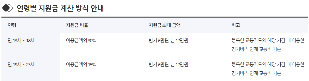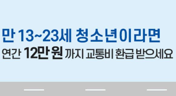 - 신청방법 : 온라인신청(경기도 청소년 교통비 지원 포털)