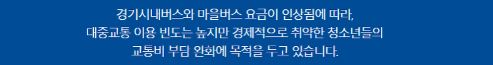경기시내 버스와 마을버스 요금에 대한 취약계층 청소년들에게 부담을 줄여주는데 목적이 있는 청소년 교통비 지원 정부 서비스 입니다.