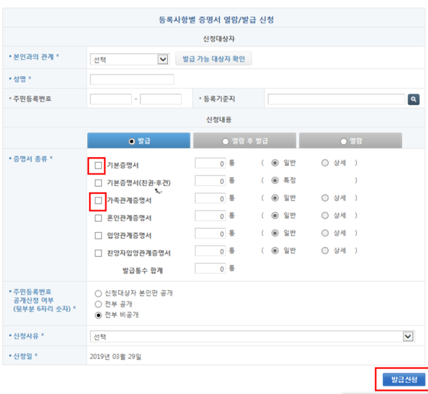 본인과의 관계에 본인을 선택하고 성명 주민등록번호 입력후 기본증명서, 가족관계 증명서에 체크 후 발급 신청을 누르시면 됩니다.