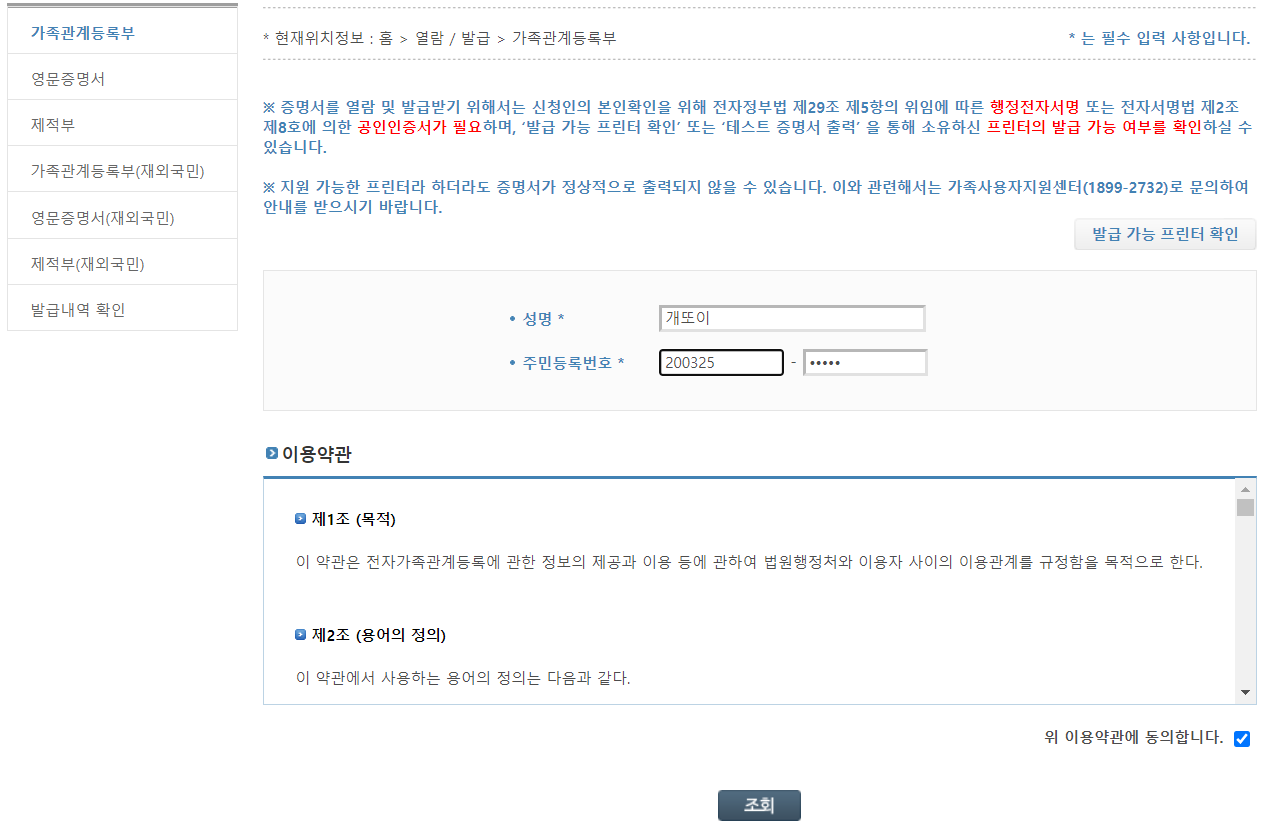 열람/발급을 클릭하시고 가족관계 등록부를 클릭하시면 테스트 증명서 출력 창이 팝업 됩니다.