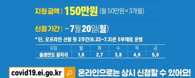 6월 22일부터 고용센터에서 7월 20일까지 신청을 받고 있습니다. 하지만 한 번에 많은 신청이 몰려 대응이 늦어지는 경우가 생기고 있습니다. 그래서 신청은 2주간 마스크 판매처럼 5부제로 운영하고 있습니다.