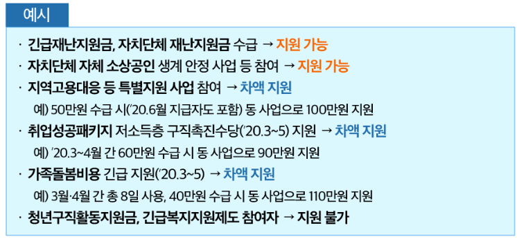 위 내용처럼 여러 가지 복지 정책으로 혜택을 받지 못한 분들을 위한 복지 정책이기 때문에 중복으로 받을 수 없는 점을 확인하시어 본인이 해당하는지 해당하지만 다른 복지혜택으로 제외되는지 확인하시기 바랍니다.