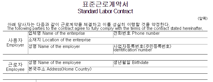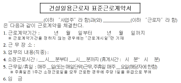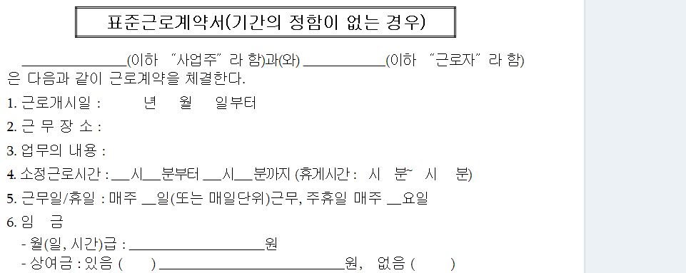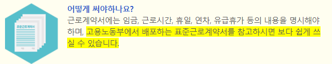 근로계약서 작성은 항상 고용노동부에서 제공하는 표준 근로계약서 양식을 가지고 작성하는 것이 정확합니다. 표준근로계약서에는 모든 항목이 포함되어 있기 때문에 일정 항목을 빠트리거나 제외하고 작성할 위험 요소가 적어지기 때문에 항상 고용노동부에서 제공하는 양식을 사용하시기 바랍니다.