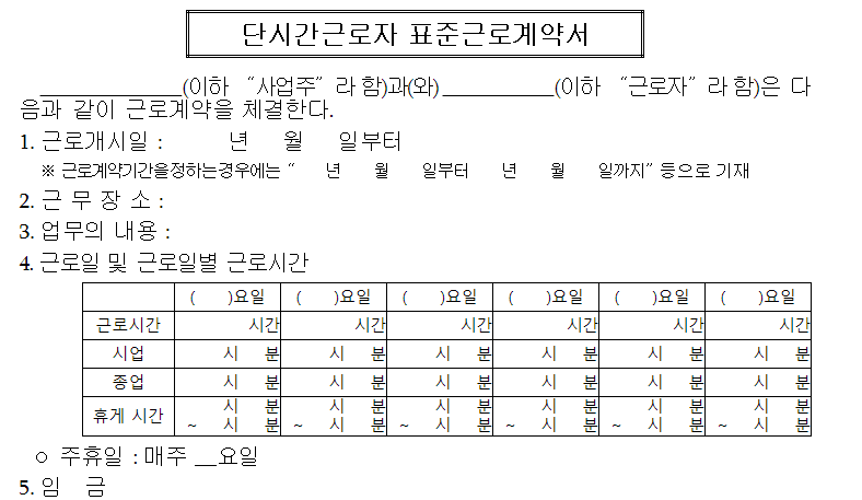 단시간근로자의 경우 근로일 및 근로일별 근로시간”을 반드시 기재하여야 합니다. 그래야 추후 분쟁이 생기는 것을 방지 할 수 있습니다. 분쟁이 많이 생기는 요소 중에 하나가 바로 단시간 계약입니다. 단기로 계약을하기 때문에 계약에 대한 내용을 소홀하게 하는 경우가 많기 때문입니다.