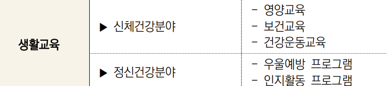 - 노인 생활교육 : 영양, 보건, 건강, 정신건강에 대한 교육을 실시 합니다.