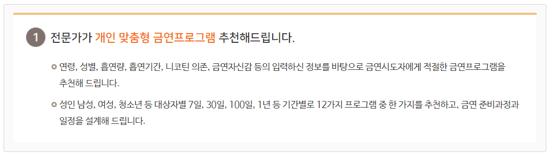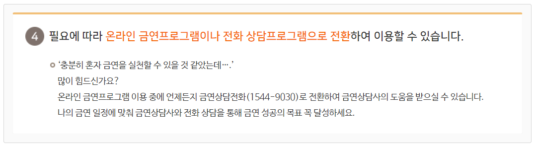 대표 전화를 통해서 금연 삼당 서비스를 제공하고 있습니다. 금연 프로그램이 다양해서 어떤 프로그램이 본인에게 적합한지 친절하게 상담을 해 주는 정부 지원 상담입니다.