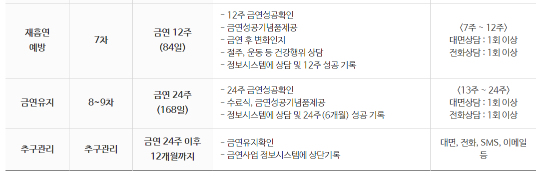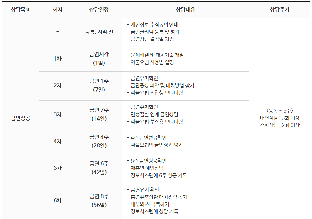 금연에 대한 내용은 금연 상담에서부터 약물요법, 금단증상 대처 방법, 부작용 검토, 금연 평가, 재흡연 예방 교육 등 담배 끊는 법에 대한 전반적인 내용이 포함됩니다.