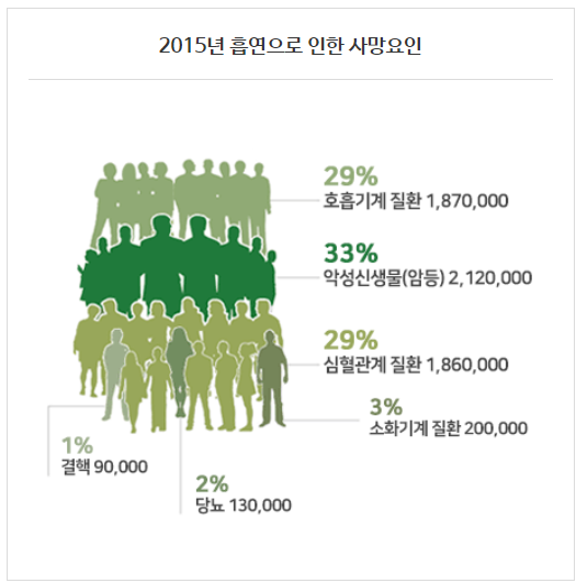 흡연에 의한 사망 원인을 분석해 보면 호흡기계 질환이 전체의 29%, 악성신생물(암) 33%, 심혈관계 질환 29%, 소화기계 질환이 3%, 당뇨 2%, 결핵 1%의 요인을 차지하게 되었습니다.